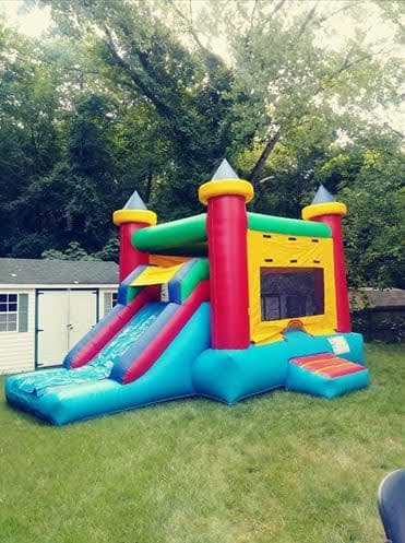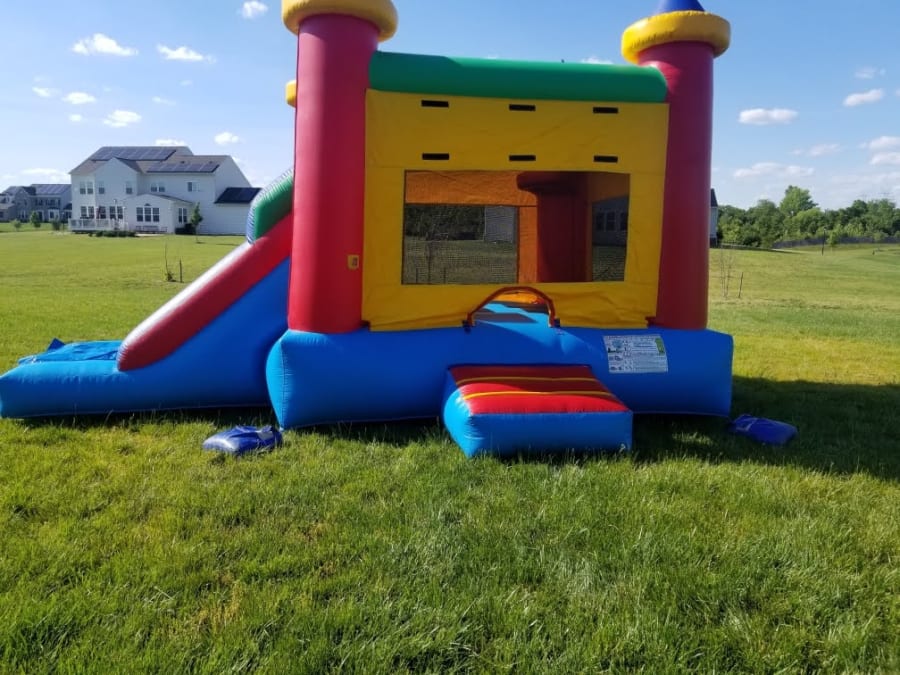 The Rainbow Combo is a bright, dry Rainbow Castle Combo with basketball hoop. It delivers big fun in a compact footprint. The unit features a 13x13 jump area and holds approximately 8 children. This standard combo blends with most party themes and is ideal for birthdays, school events, church functions, and backyard celebrations. Dimensions are approximately 13W x 23L x 14H. 🌈🏀